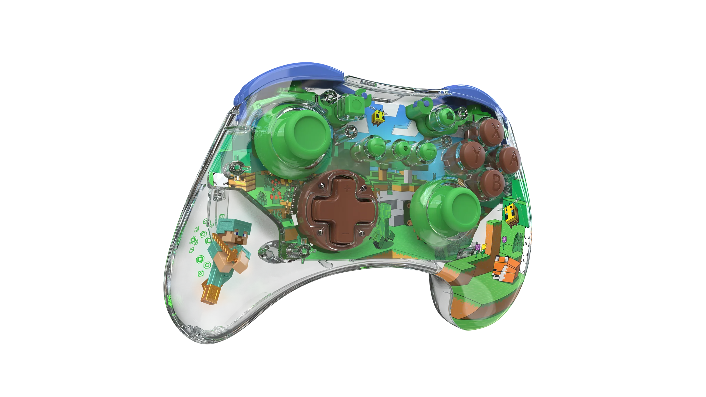 Experience a new realm of gaming with the Minecraft Forest Biome REALMz™ Wireless Controller. Enjoy the immersive universe from your favorite games with this one-of-a-kind controller featuring a collectible figurine inside the grip. Discover the world inside your game and the controller with its unique, multi-layer design showcasing iconic scenes from your favorite title. With a built-in, rechargeable battery you won't need to purchase single-use batteries, so you can save the planet and your bank account. Get comfy on the couch for a long day of gaming with the 30-foot wireless range and expertly designed shape. Effortlessly change the LED lighting effects using the ABXY buttons to add another level to the look of your controller. Explore the realmz with this uniquely immersive controller, officially licensed by Nintendo® and Mojang Studios. Find the Random Spawn! There is a 1 in 6 chance of unique mob designed controller. **Does not support Motion Controls**